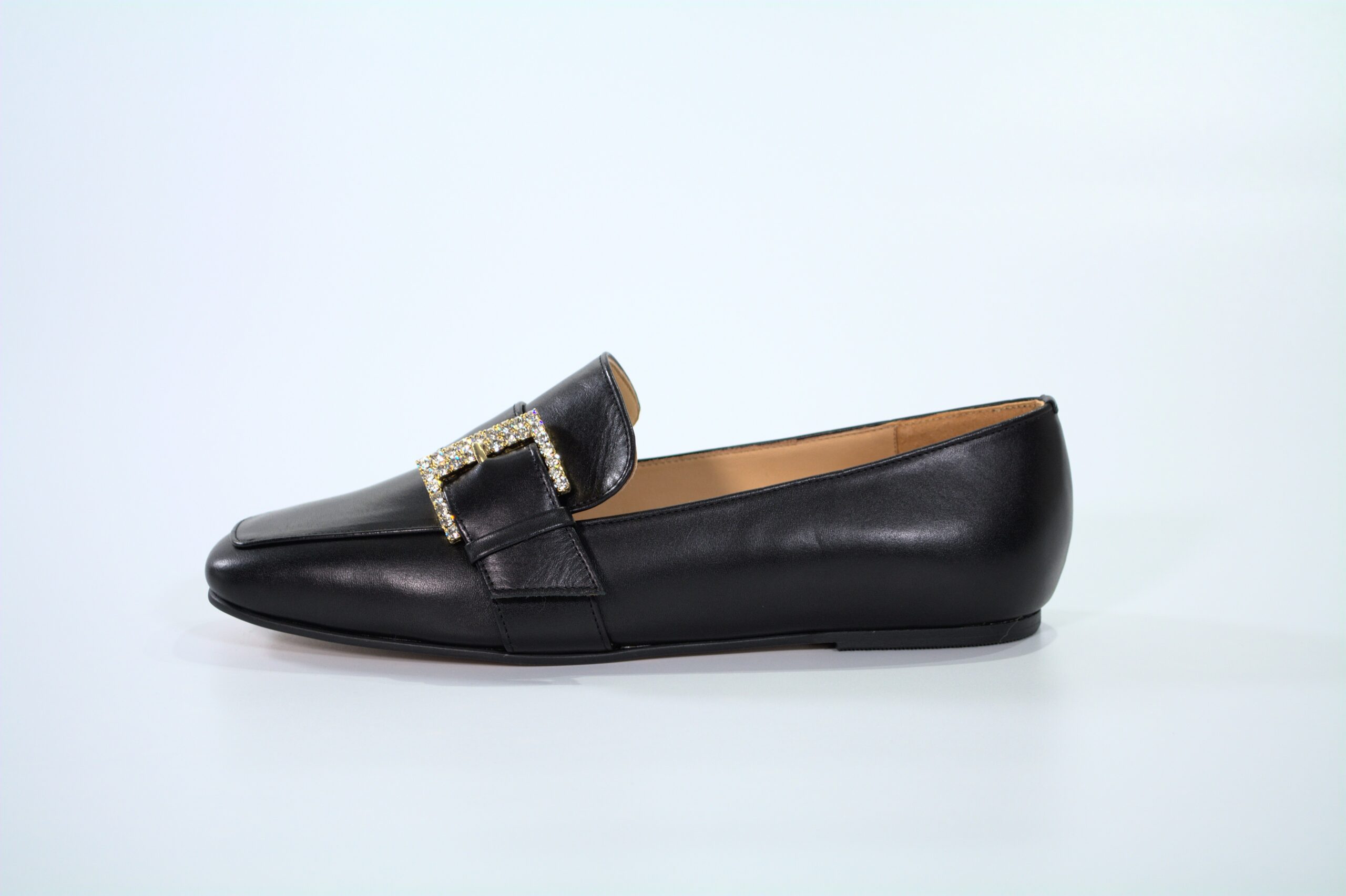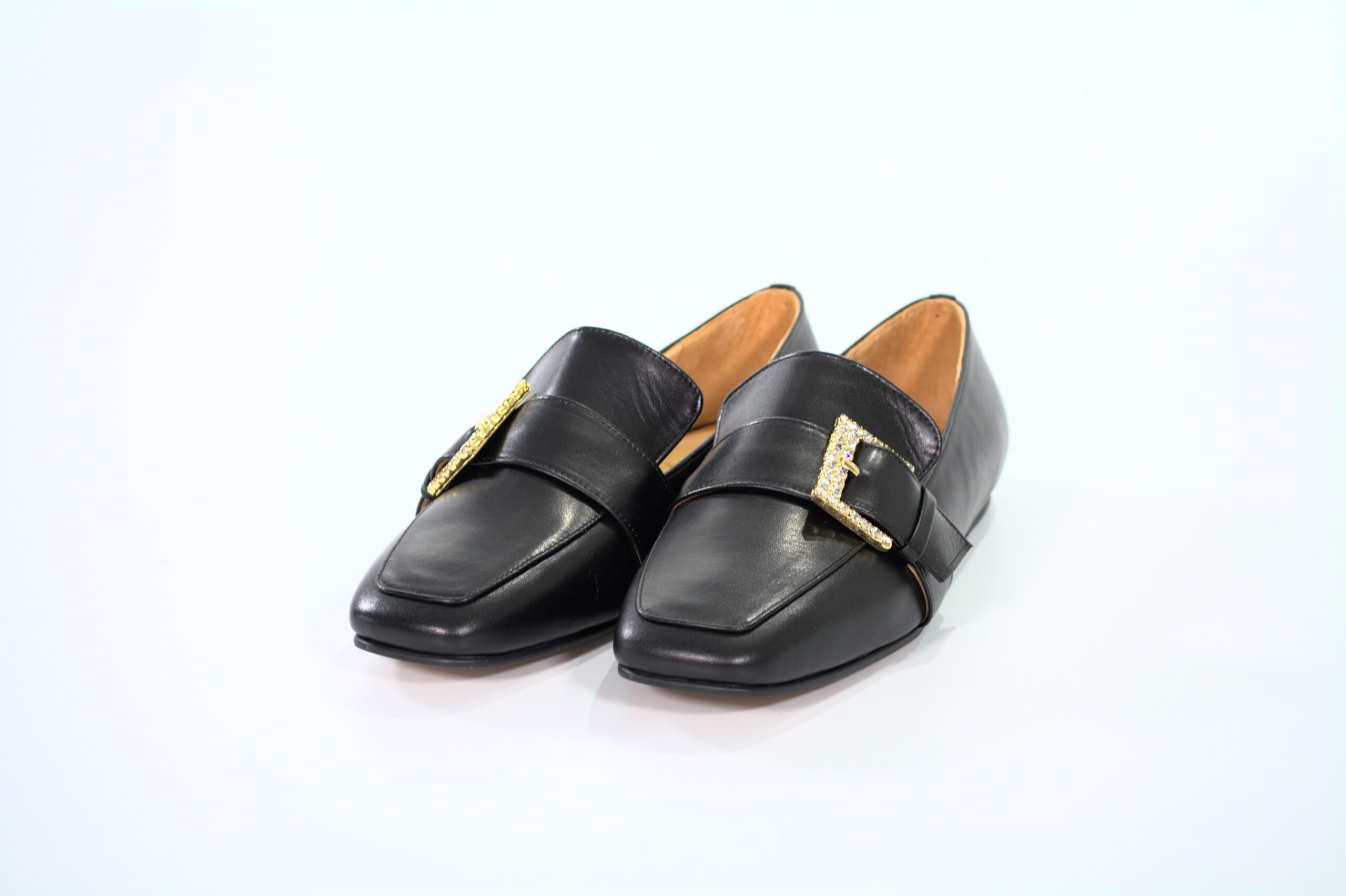 スクゥエアトゥのフラットシューズにカットと輝きが綺麗な石を付けた甲ベルトがシンプルコーディネートに