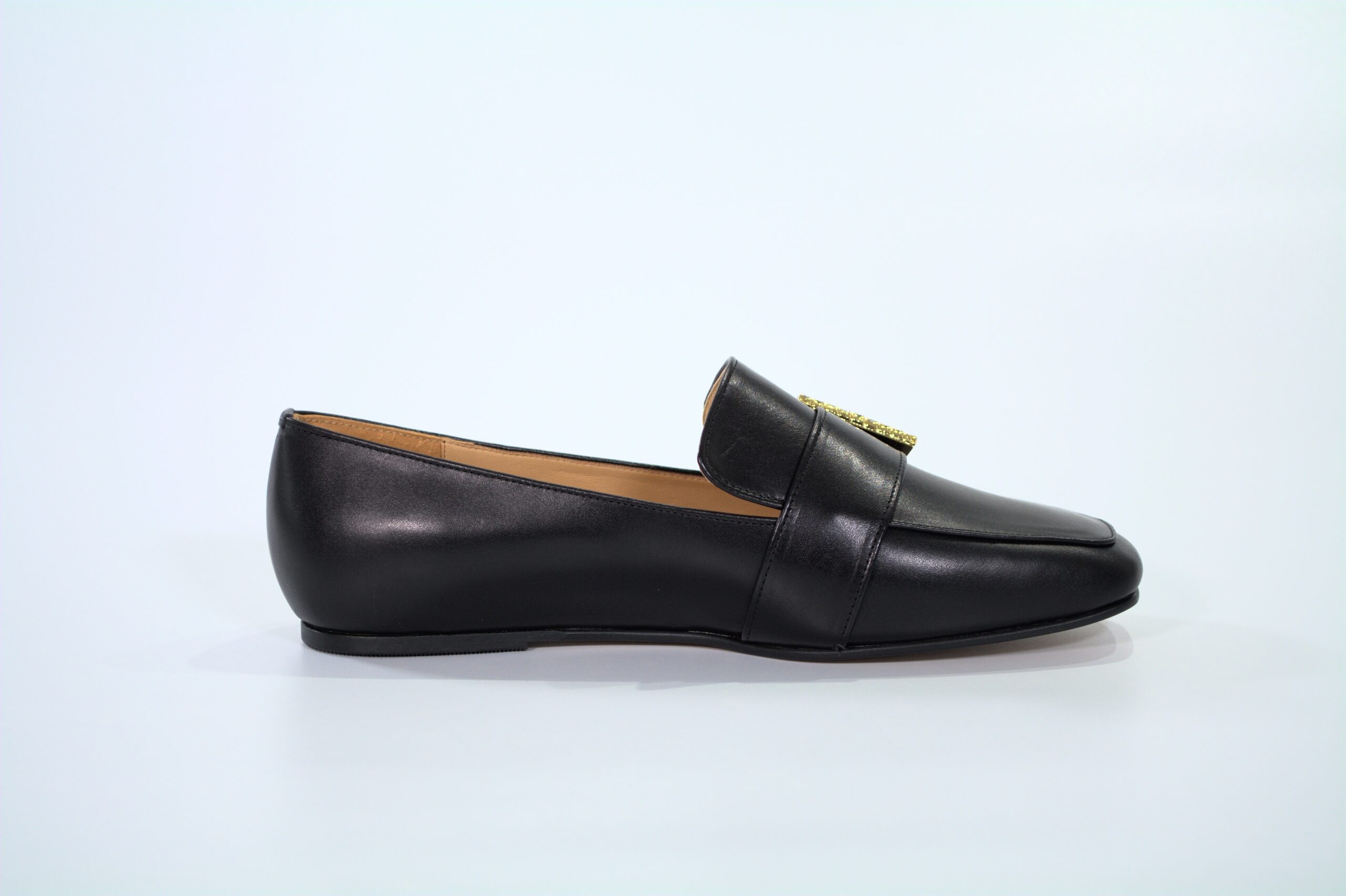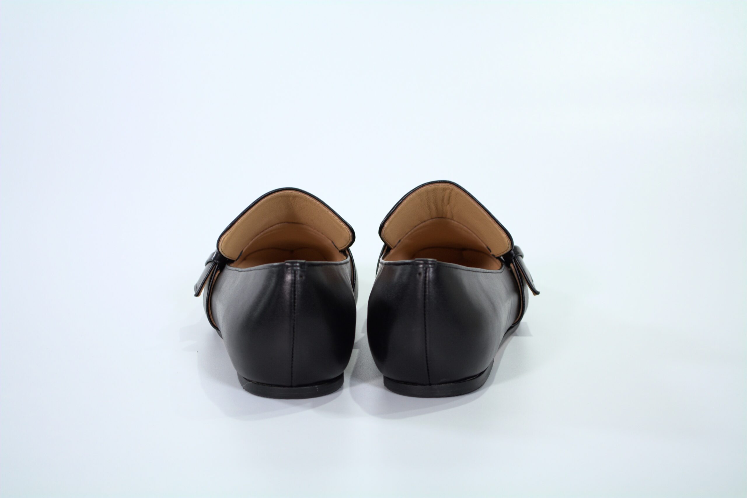日本製牛革のキップ使用、肌目がきめ細やかで黒味もしっかりある材料を使用しています。黒とクリスタルのコントラストが抜群です。