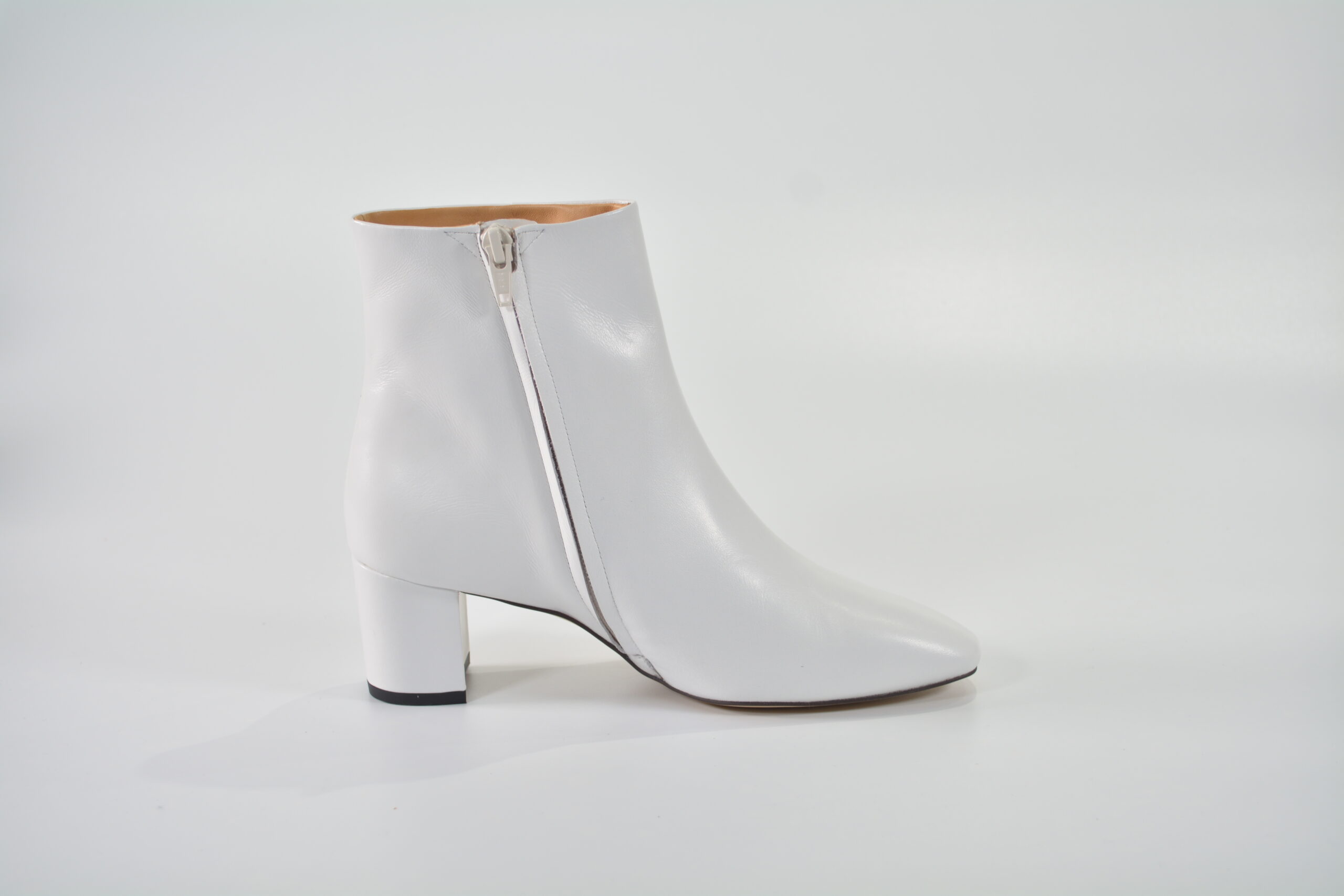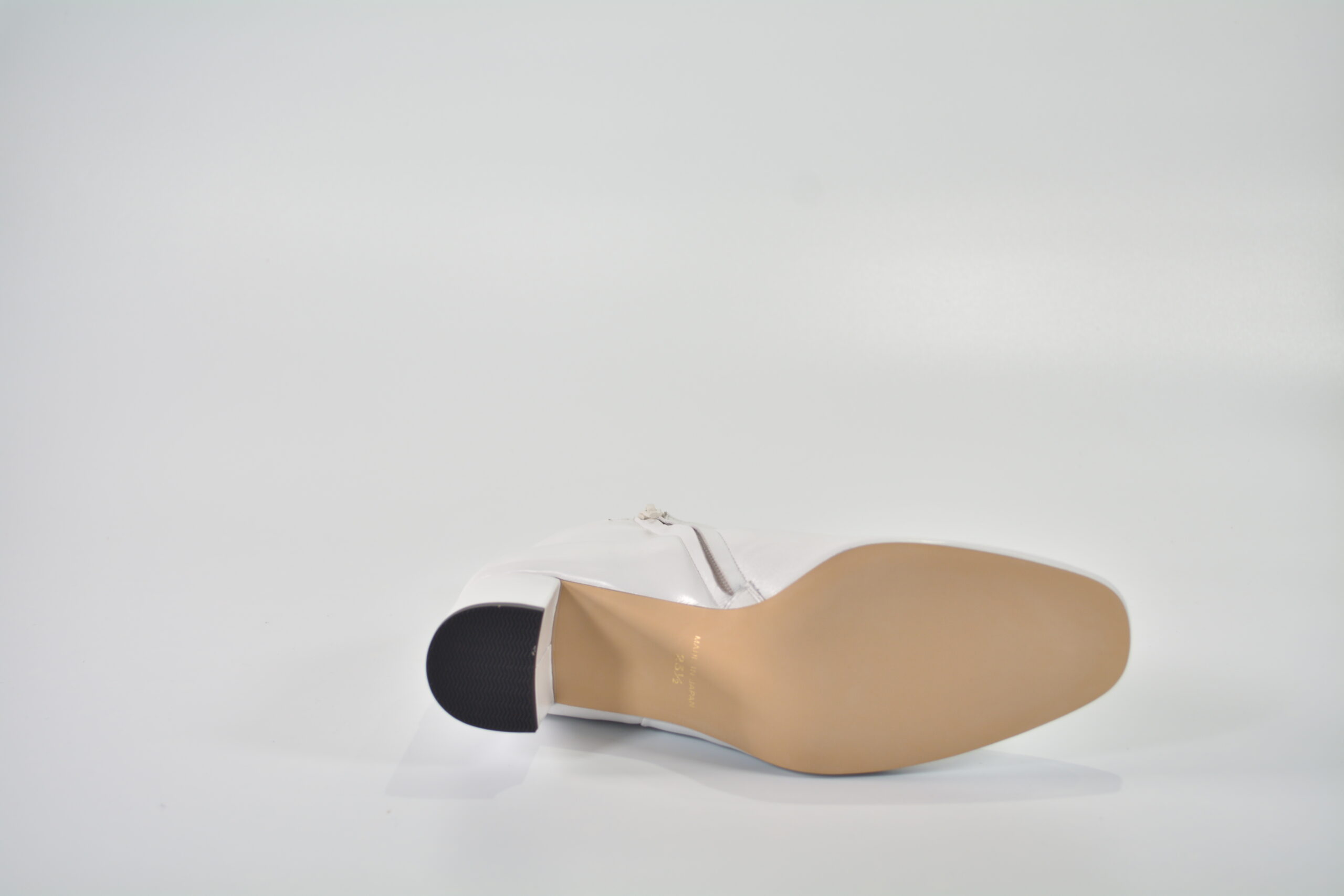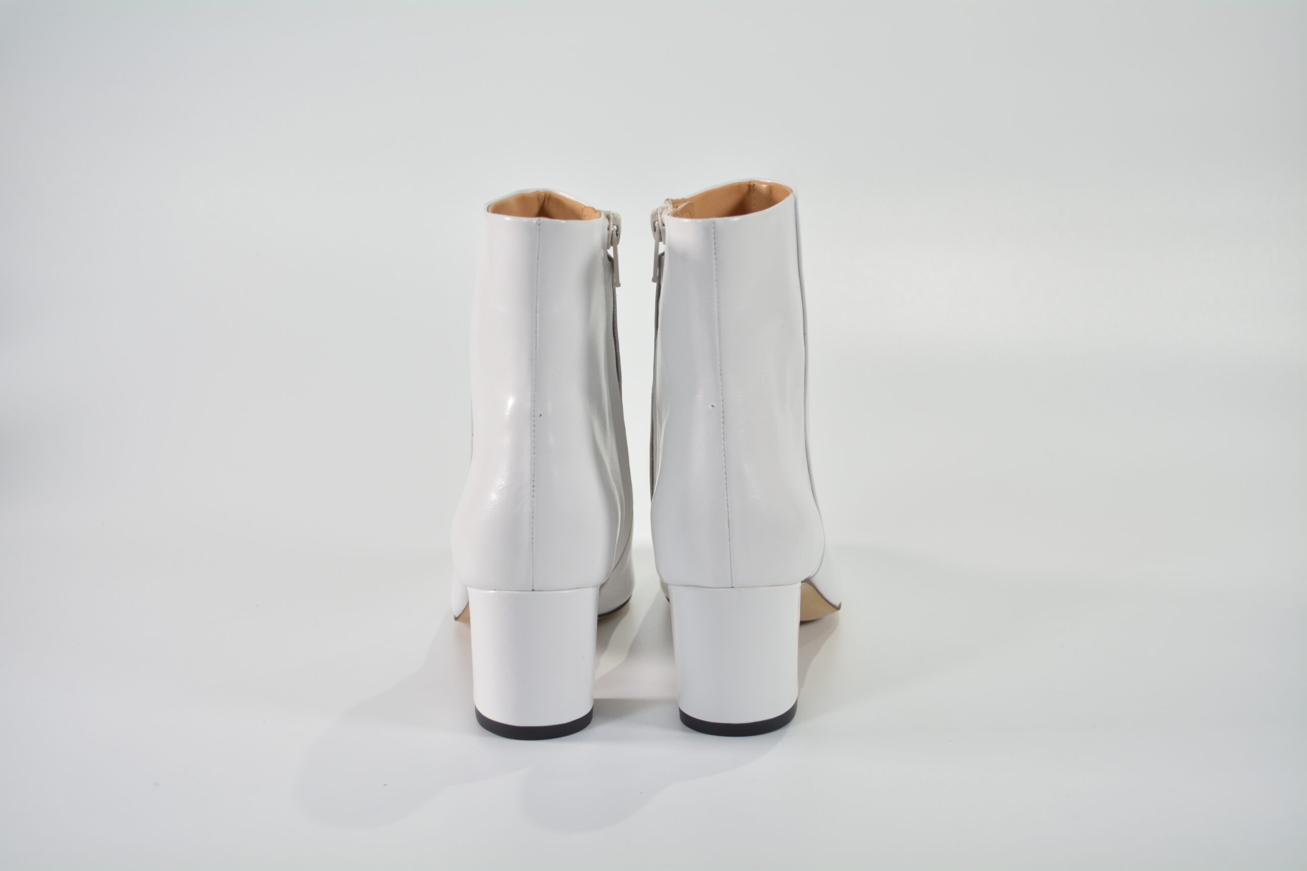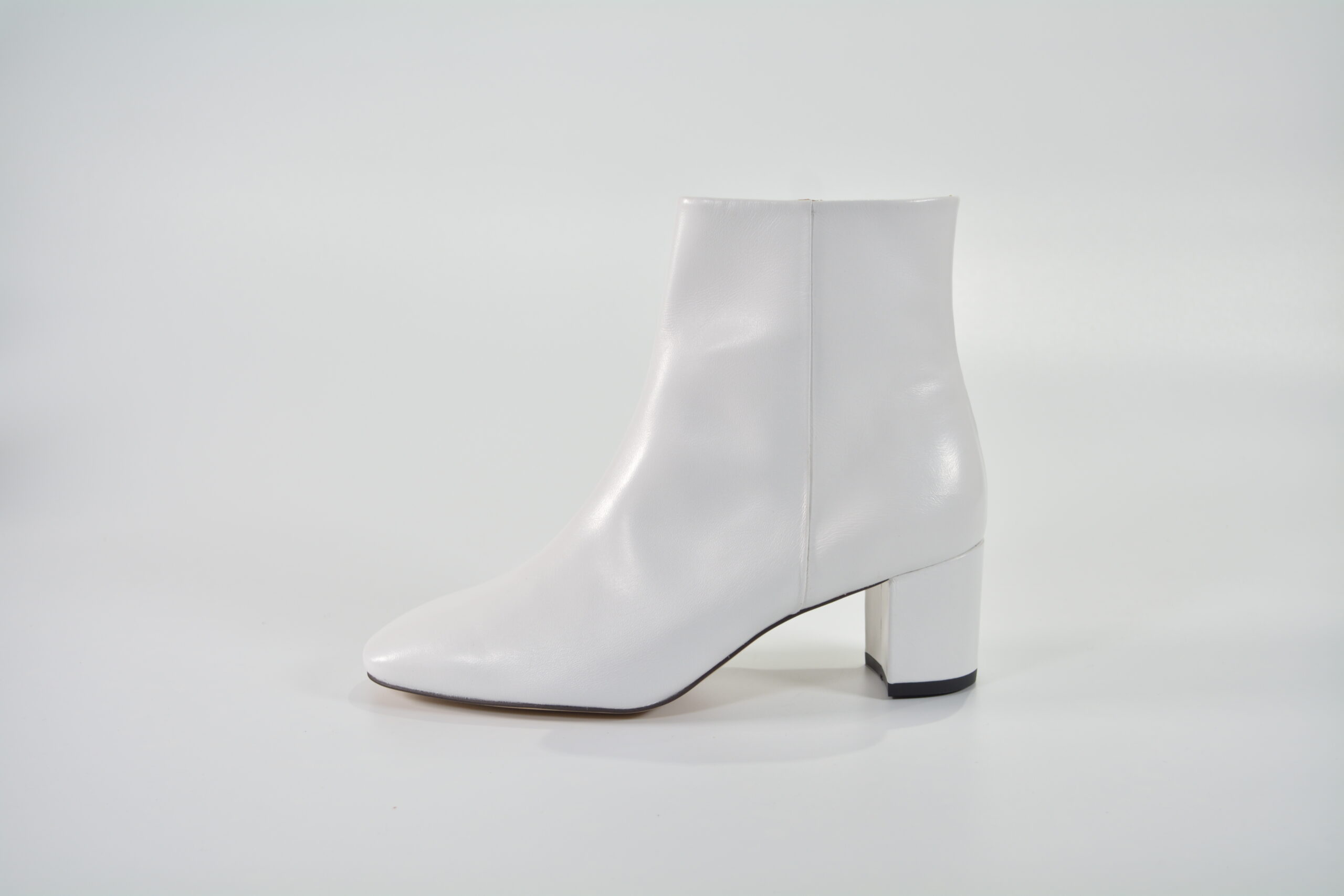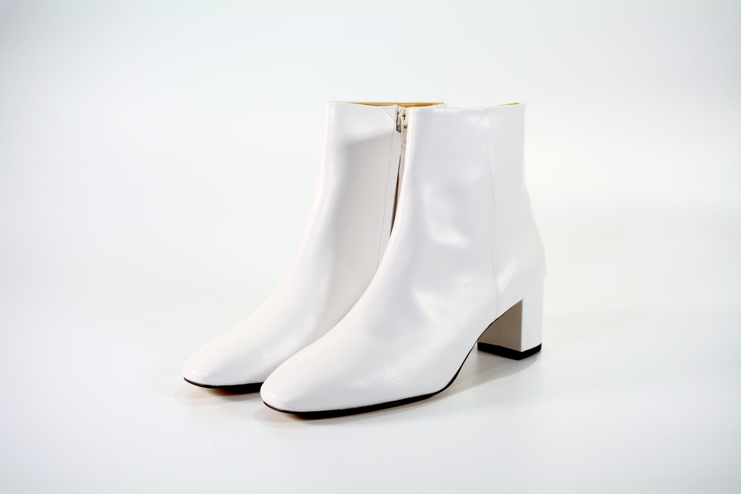この秋冬の主役、ショートブーツ 太いヒールで安定感抜群、でもボリューム感を抑えるために筒は若干細めにして シルエットがシャープに見えるようにしました。 今年も本命色ホワイトはいかがでしょうか?