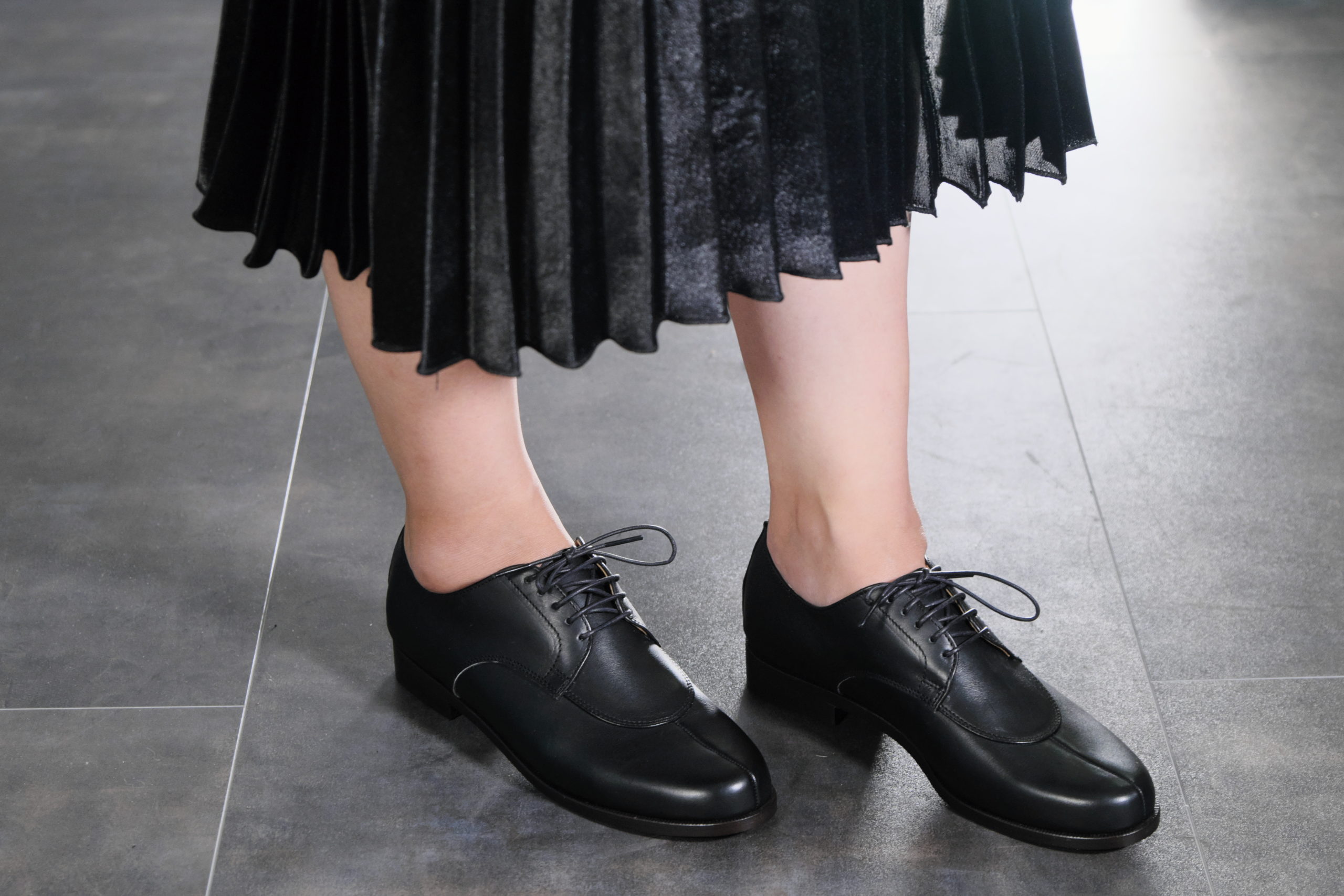 マニッシュなスタイリングのアクセントに欠かせないUチップレースアップシューズ 切り替え部分を少しだけ短くしてモード感をさりげなく入れています。